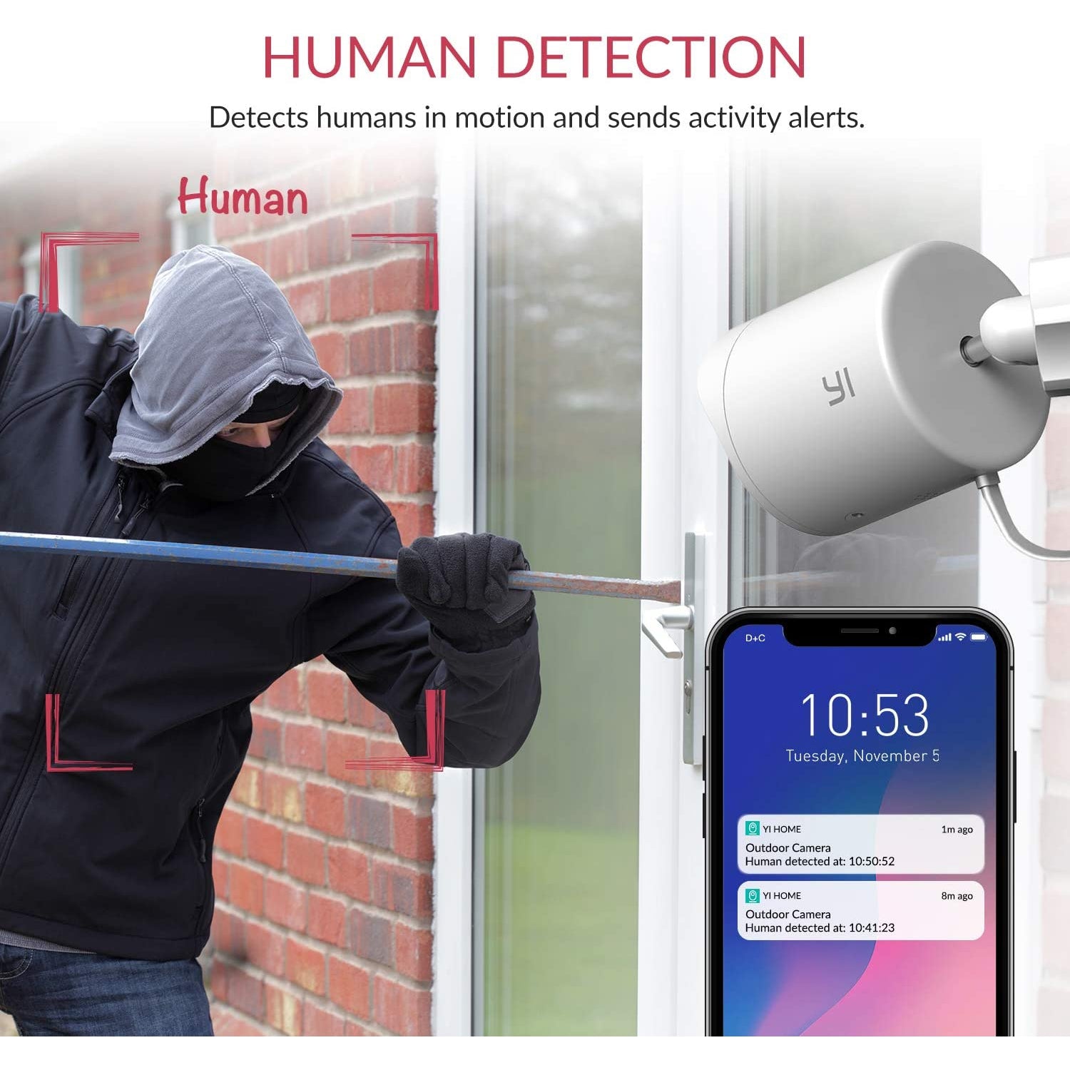 - SMART ACTIVITY DETECTION WITH ARTIFICIAL INTELLIGENCE - HUMAN DETECTION: Detects people in motion up to 20 fps - SOUND DETECTION: Detects sounds between 50 and 90+ dB (adjustable) – PUSH-NOTIFICATIONS & VIDEOS OF THE DETECTED ACTIVITY: Push notifications on your smartphone (adjustable frequency and sensitivity levels) with 6 seconds of video for each activity detected by the camera – OPTIONAL: CREATE ACTIVITY ZONES: Possibility to only get alerted when activity is detected within the set area.