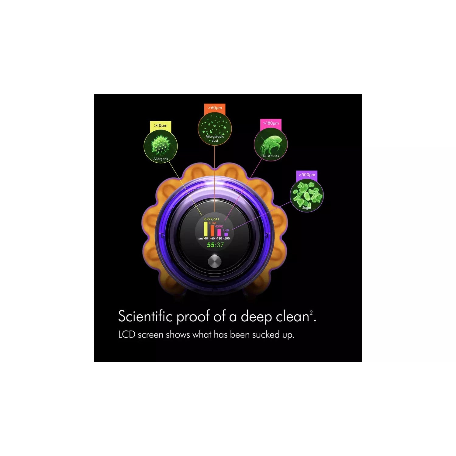 The most powerful, intelligent cordless vacuum. Measures microscopic dust particles. A piezo sensor continuously sizes and counts dust particles – automatically increasing suction power when needed. Scientific proof of a deep clean. The LCD screen shows what's been sucked up, displaying real-time scientific proof of a deep clean.