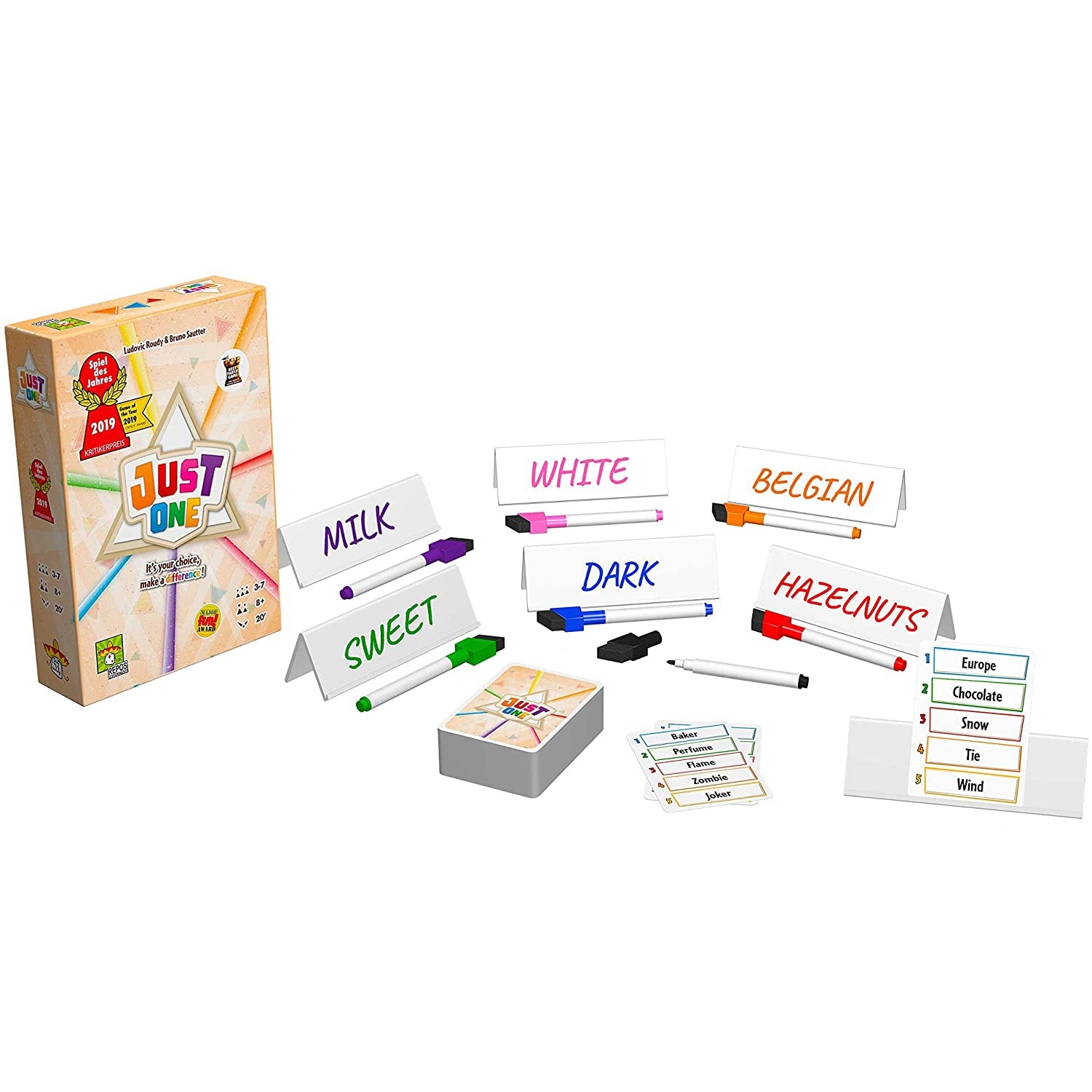 Just One is a cooperative party game in which players discover as many mystery words as possible. Includes 550 words to guess (and make others guess) and quality erasable markers to write clues. One of the players draws a card without looking at it and randomly chooses a number from 1 to 5. Secretly write a clue on your easel, then compare your easels and cancel any identical clues. Show the remaining easels to the player so that they can guess the Mystery Word!
