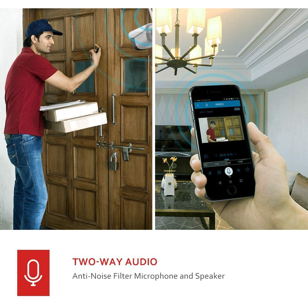PC730 Wi-Fi camera features in microphone and high-power speaker. With the built-in microphone on the camera, you can listen and talk with visitors or postmen through the IPC360 app.